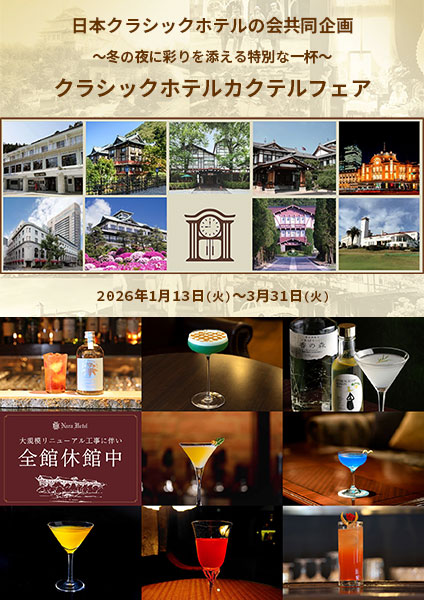 クラシックホテルの歴史を受け継ぐ各ホテルのバーテンダーが考案した、期間限定のカクテルフェアを開催いたします。ホテルごとの物語や地域の特性を込めた、とっておきのカクテルをご用意。テーマは「伝統と歴史」そして「フルーティー」。格別な一杯が、この冬の夜を華やかに彩ります。