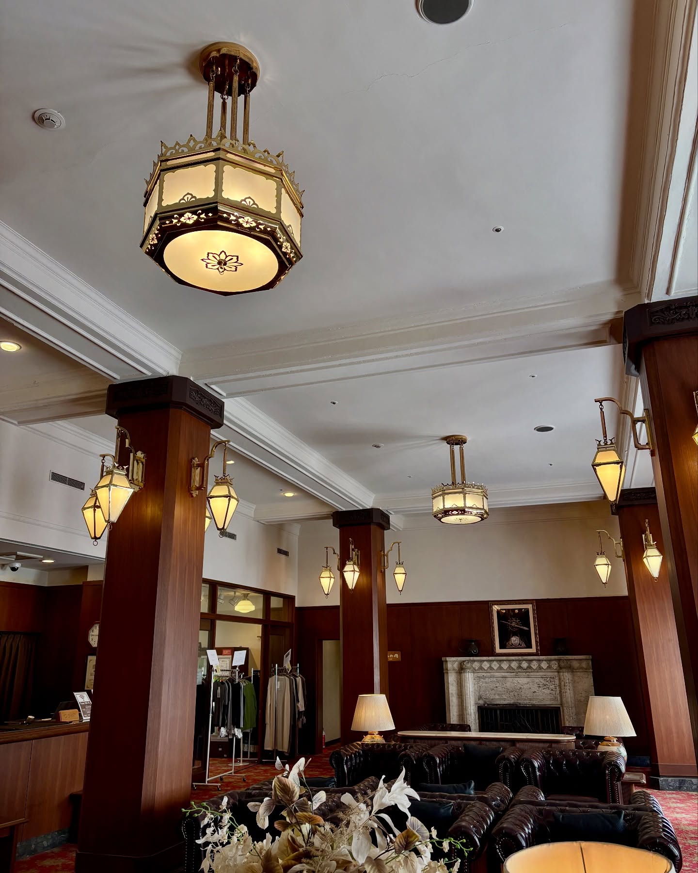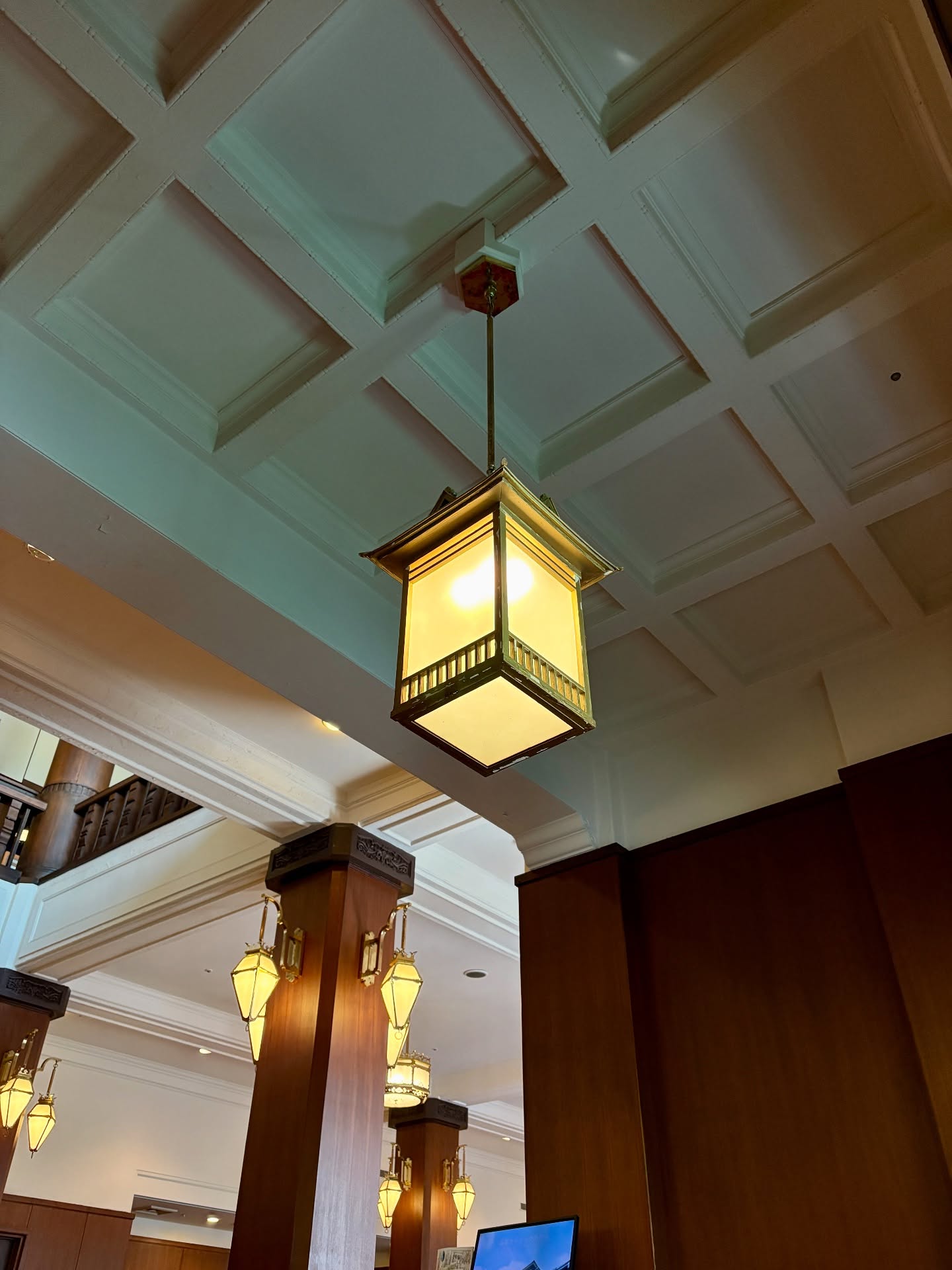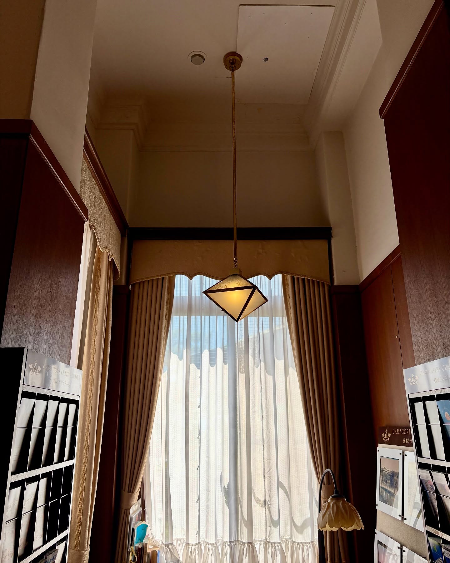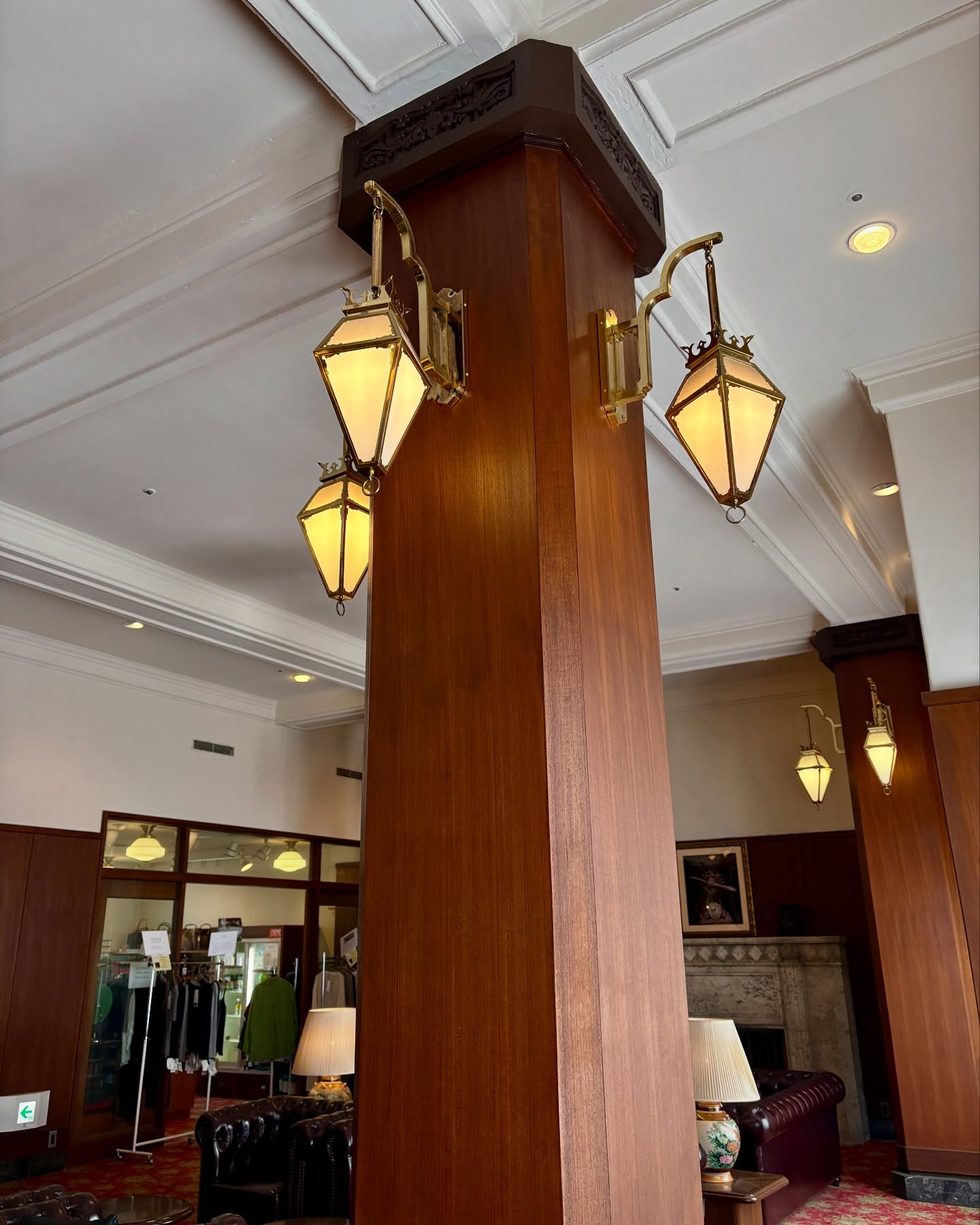 独特でありながらも華やかさ、上品さを感じさせるこれら照明は、ロビーのレトロな雰囲気を際立たせ唯一無二の空間を創り出しています。