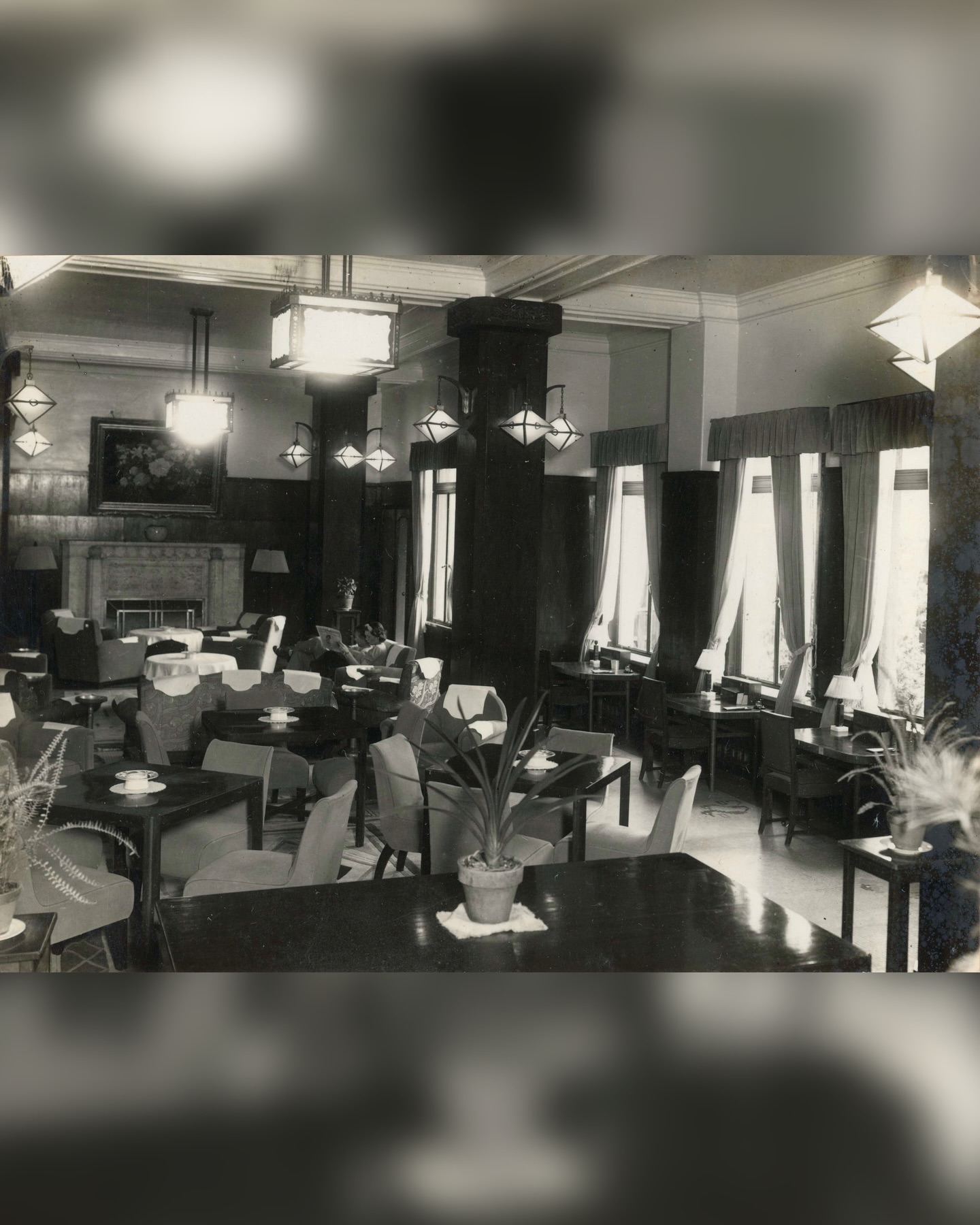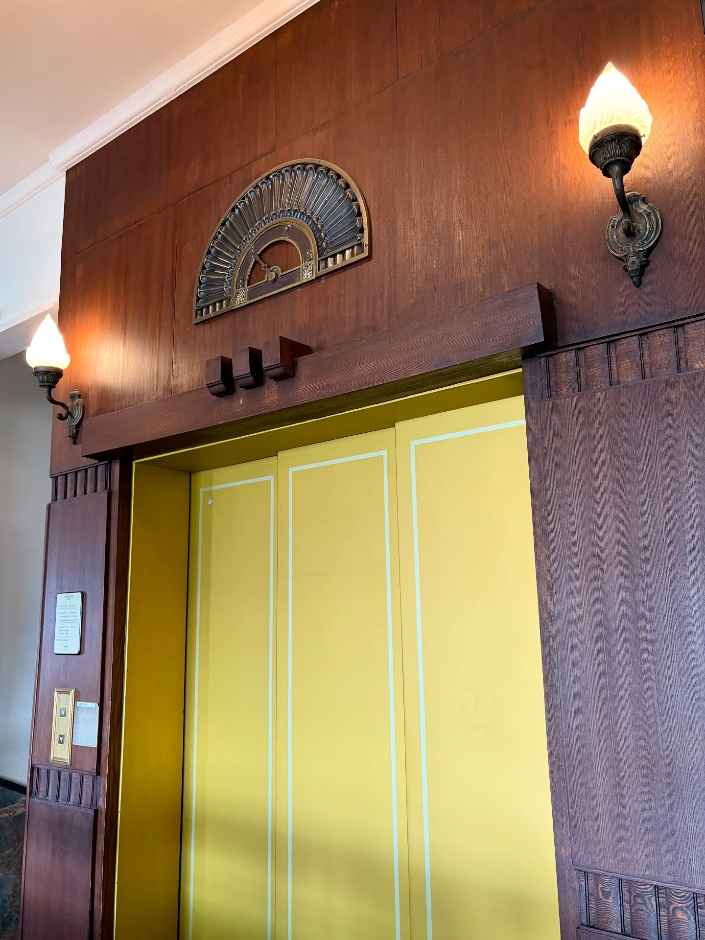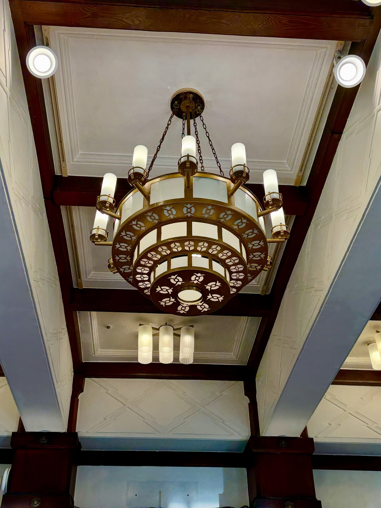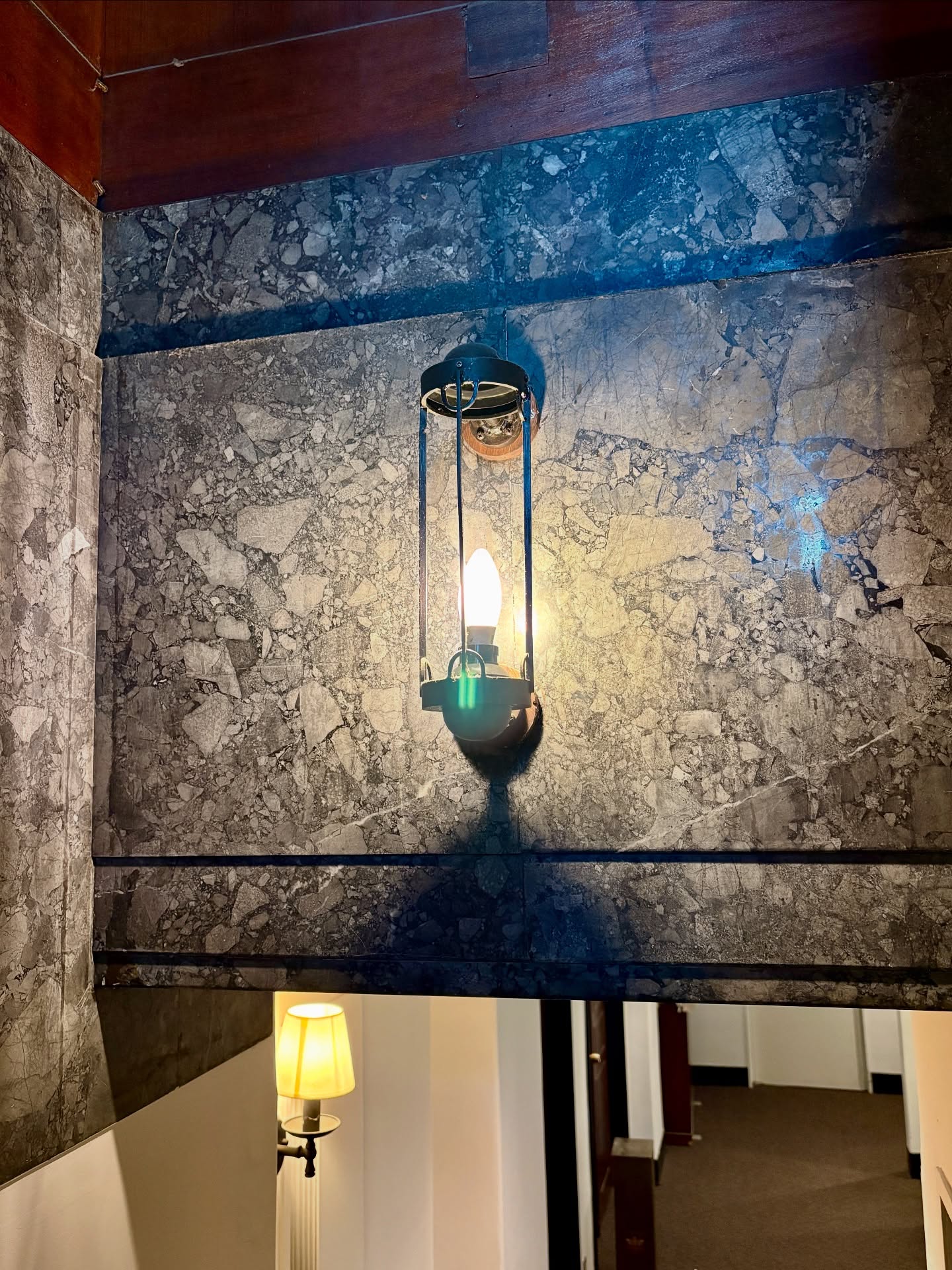 独特でありながらも華やかさ、上品さを感じさせるこれら照明は、ロビーのレトロな雰囲気を際立たせ唯一無二の空間を創り出しています。