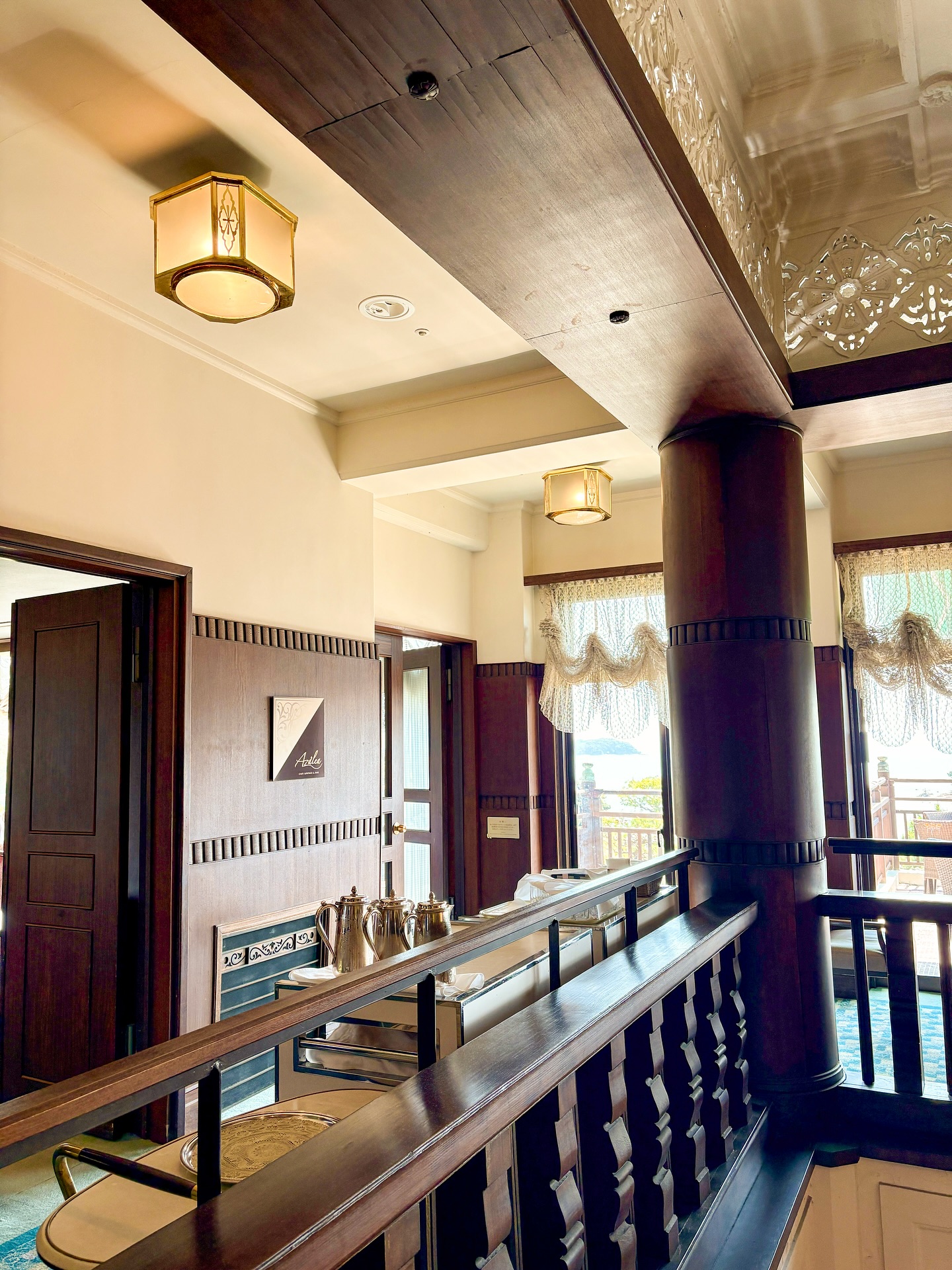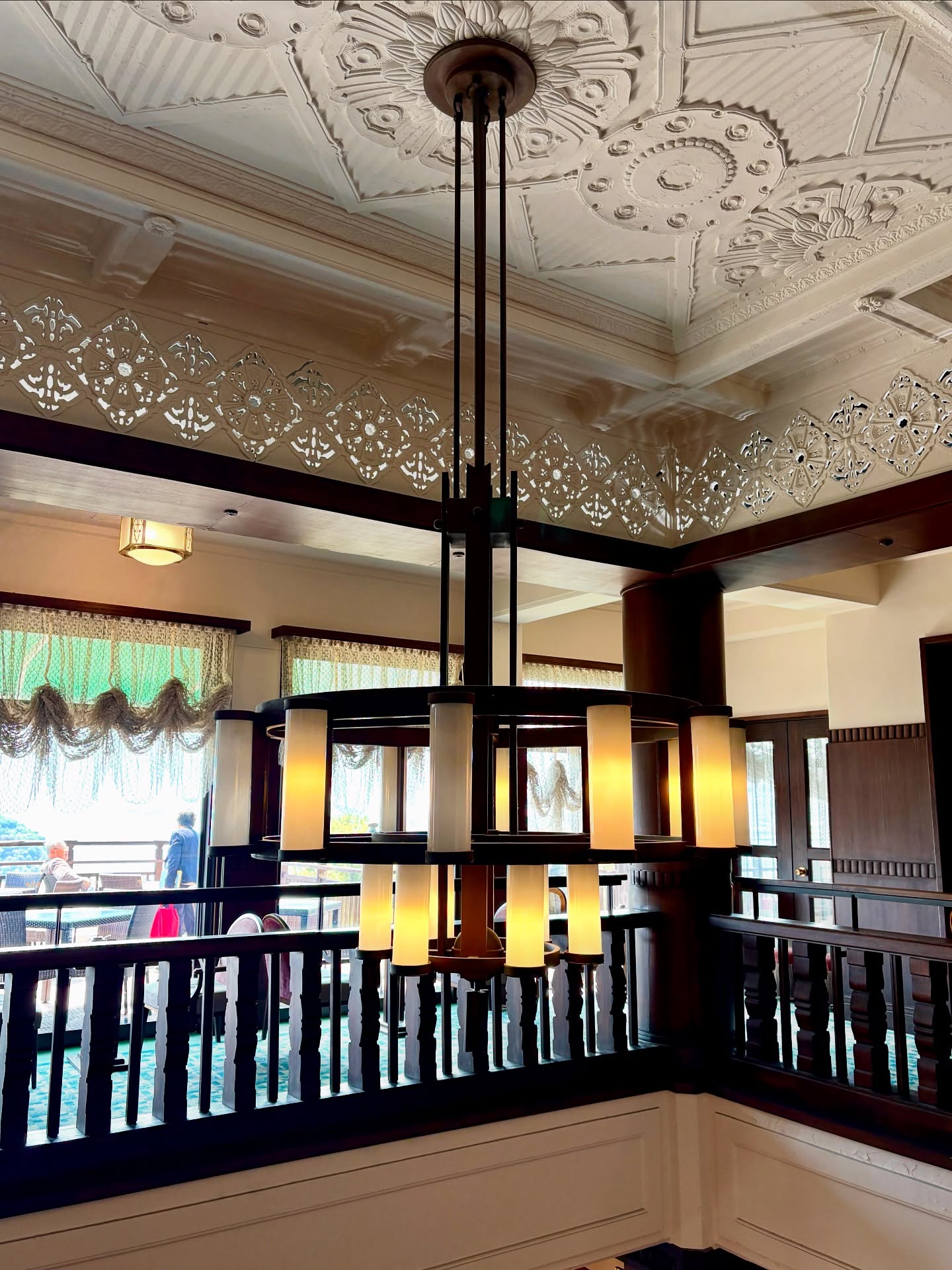 2階の吹き抜けを囲むようにあり、照明の角には装飾があります。